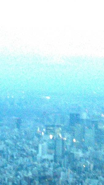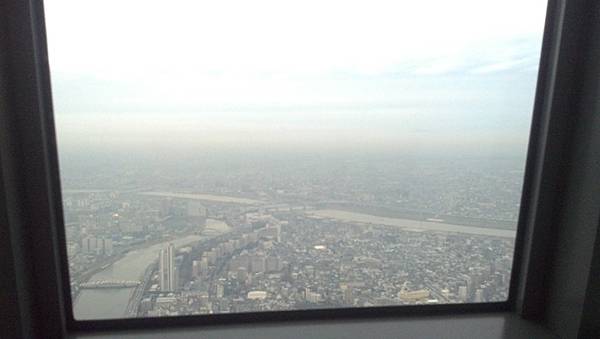 這個高度的景觀,可是排了50分鐘的隊,才從地面搭快速電梯(1分鐘)到達350公尺高的晴空塔 (Sky Tree)觀景台上照的景色。我在灰濛濛天空渲染上夜色前,在這個高度看到了遙遠處的富士山。趕緊叫主管和陪我們上去的當地廠商來看。因為富士山對日本人來說是個神聖的象徵,而且也蠻難得從東京看到富士山,一切就是要看運氣好不好啦。^ ^。看來我們的運氣不錯。